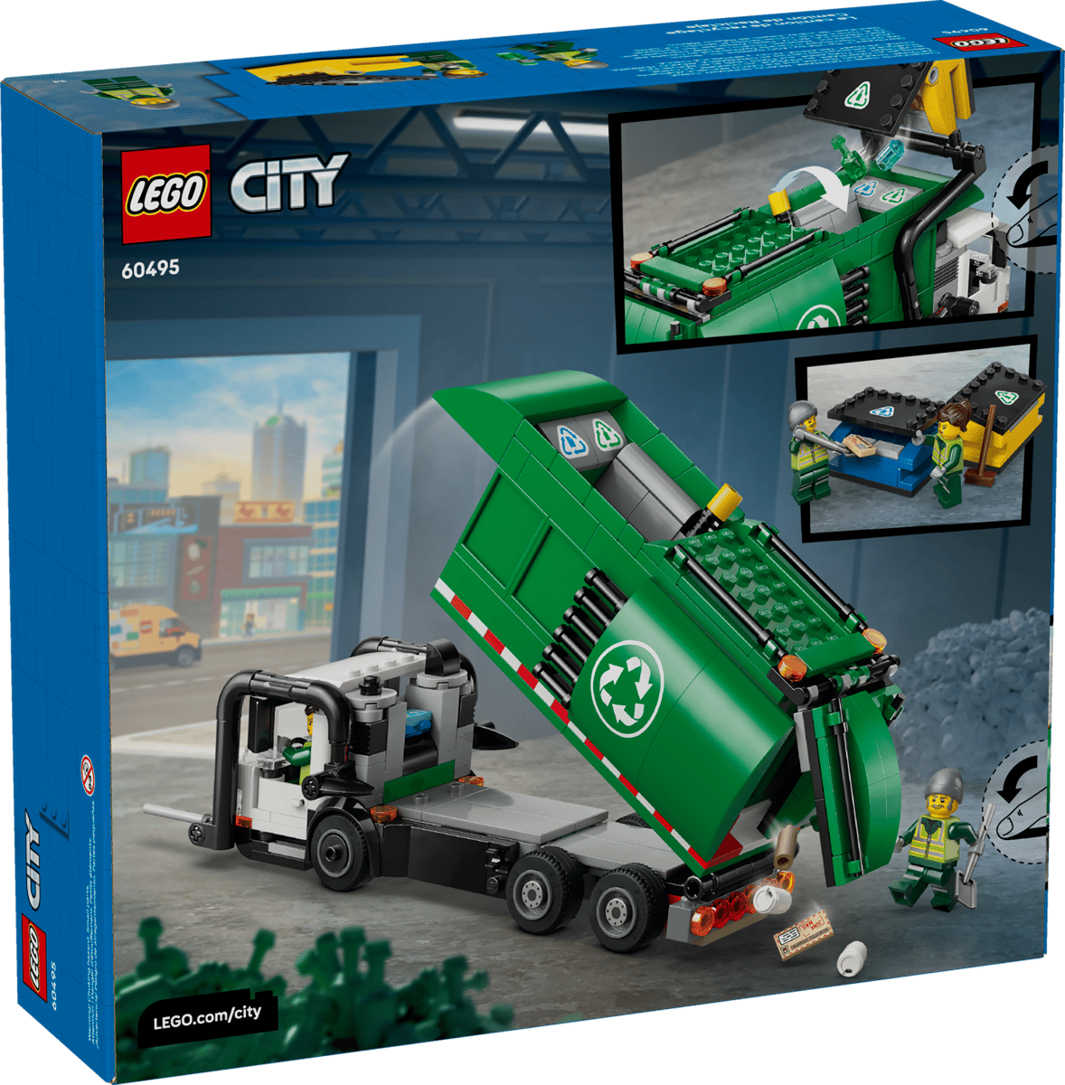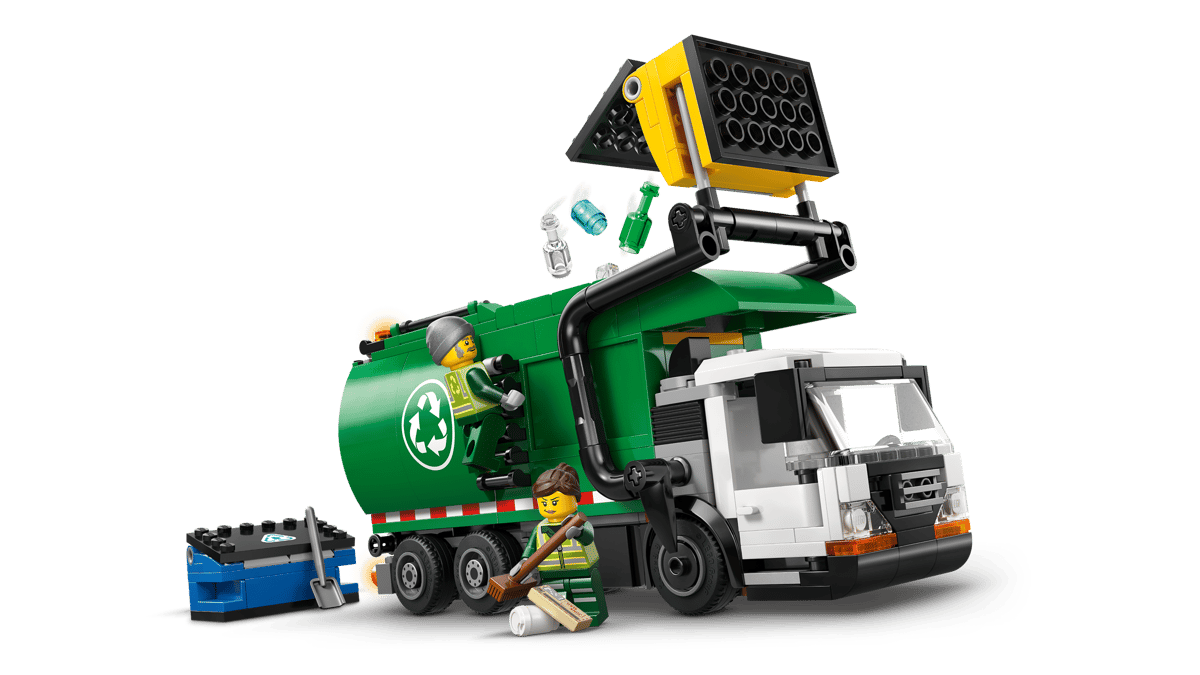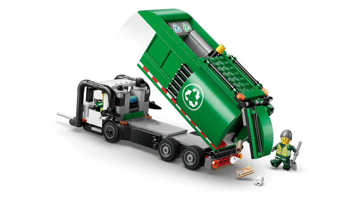 This LEGO® City Recycling Truck toy building set (60495) is packed with realistic details for imaginative play. The toy truck has a divider to sort the LEGO glass and paper elements, plus storage clips for tools and a detailed driver’s cab. Kids can tilt the cab to view the pretend electric motor, push a lever to lift and empty the 2 dumpsters into the truck and raise the container to tip the sorted waste through either of the 2 rear hatches. Just add the driver and worker minifigures and let the adventures begin. This detailed kids’ model truck kit makes a great gift for 7-year-old boys and girls who love hands-on interactive toys for creative play. Add it to other LEGO City sets (sold separately) for more adventures. With this LEGO Recycling Truck playset, kids can enjoy intuitive building with the LEGO Builder app, zooming and rotating with 3D instructions while saving and tracking progress as they build – all from the app. Set contains 434 pieces.